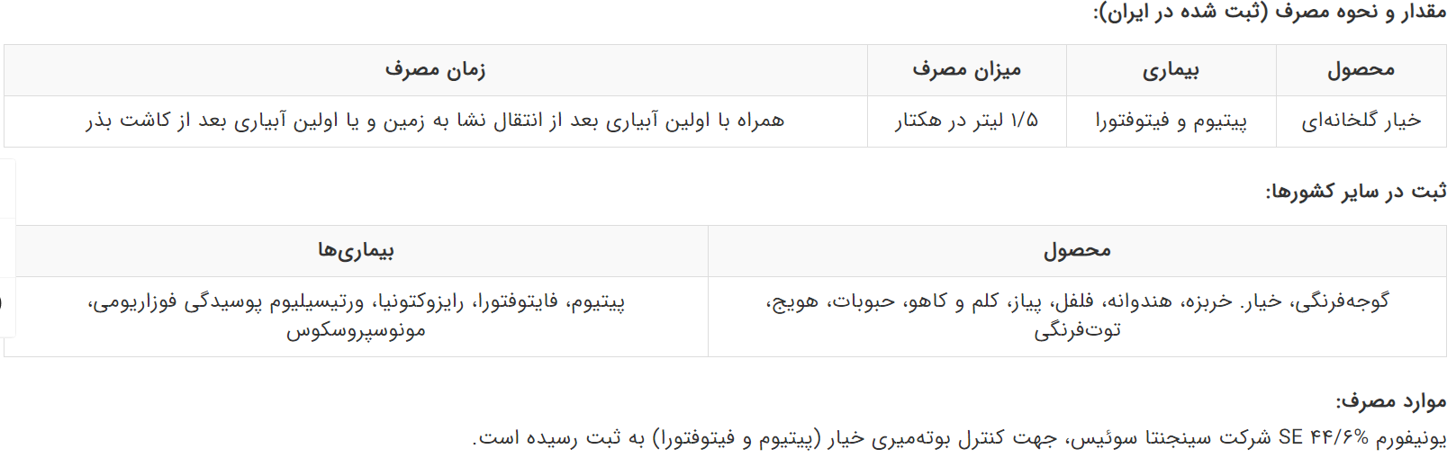 یونیفورم %44/6 SE شرکت سینجنتا سوئیس، ترکیب دو ماده مؤثره آزوکسیاستروبین و مفنوکسام با نحوه اثر متفاوت که علاوه بر خاصیت همافزایی، موجب کنترل مؤثرتر بیماریها میگردد؛ این قارچکش از اولین مرحله رشد گیاه از طریق ریشه و ساقه جذب شده و همانند واکسینه کردن گیاه، رشد ایمن و سلامت را برای مدت طولانی در گیاه تضمین مینماید. یونیفورم با خاصیت سیستمیک از نفوذ و رشد میسلیومهای قارچ به بافت گیاه جلوگیری میکند؛ همچنین قادر به کنترل طیف وسیعی از بیمارگرهای گروه اوومیست و سایر بیماریهای خاکزاد میباشد. این قارچکش مانع بروز مقاومت در قارچها نیز میشود. بنابراین یونیفورم گزینه بسیار مناسبی در مدیریت تلفیقی کنترل آفات (IPM) در گلخانه محسوب میشود.